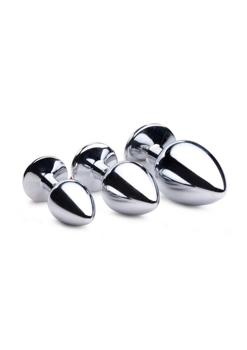This anal plug set includes three graduated anal plugs, perfect for all skill levels to explore anal play with ease. Tapered and smooth for an easy entry, and made with a nickel-free aluminum alloy for worry free body-safe fill.